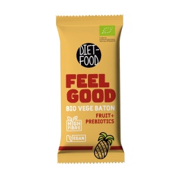 Bio Vegan Bar FEEL GOOD is based on bio date paste with pineapple, almonds, coconut, baobab, oatmeal and prebiotics. The product is 100% vegan, perfect for vegan and vegetarian diets. The bar is the perfect snack when traveling, at work or at school.