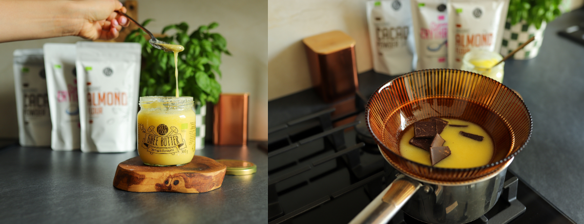 - Rozpuść masło ghee z pokruszoną czekoladą w kąpieli wodnej.