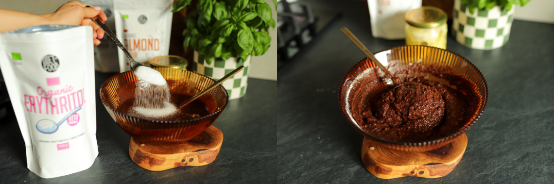 - Dodaj erytrytol, kakao, mąkę migdałową, ziemniaczaną, proszek do pieczenia i sól. Dokładnie wymieszaj.